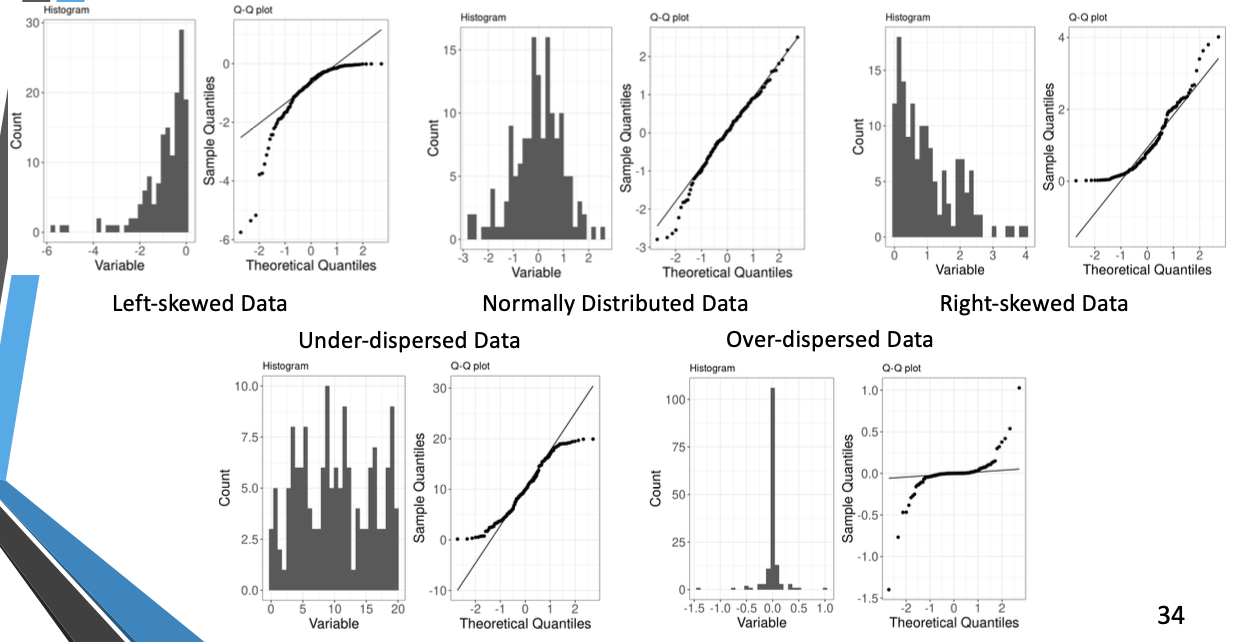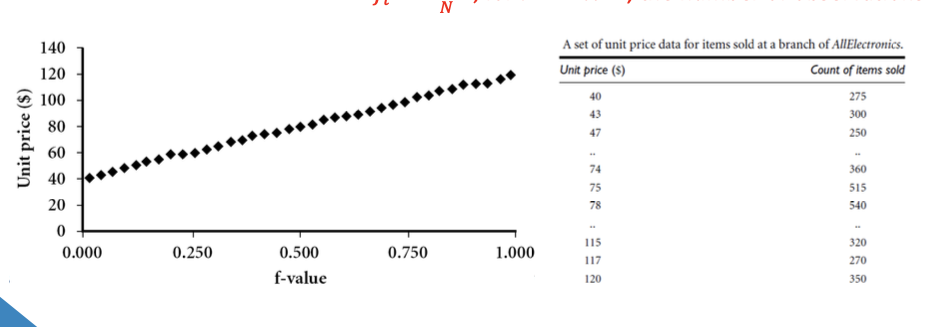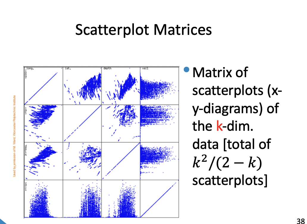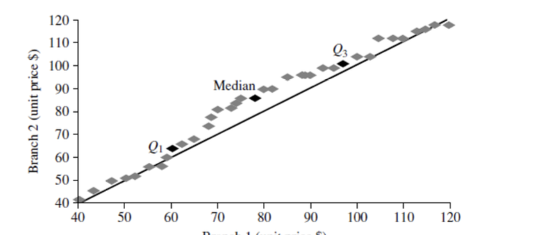 Boxplot - 5 number summary (min, , median, , max) Histogram - x-axis are values, y-axis represent frequencies Quantile plot - each value is paired with indicating that approximately 100 of data are Quantile-quantile plot: graphs quantiles of univariant distribution against quantiles of another Scatter Plot: pair of values plotted as points on a plane