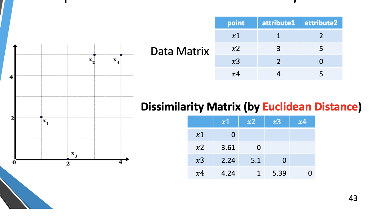Similarity Measure - function that quantifies similarity Dissimilarity Measure - numerical measure of how different two objects are ( or )